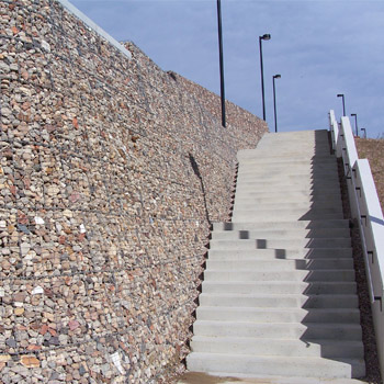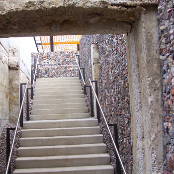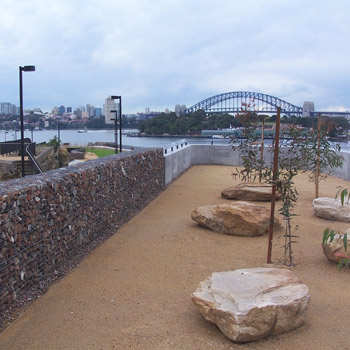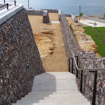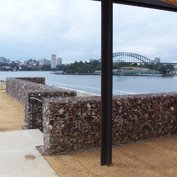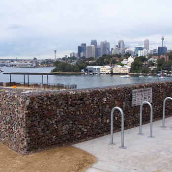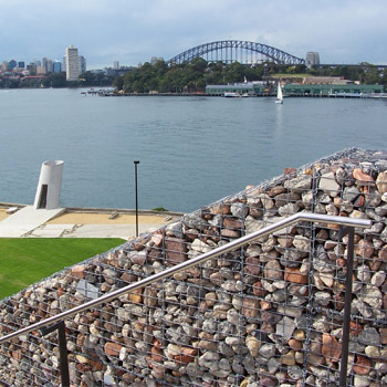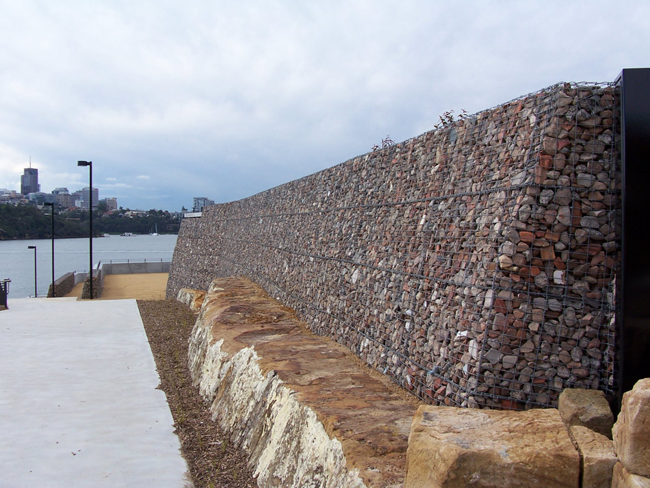 The welded mesh gabions are filled with recycled concrete, brick and tile to provide a link between the old and the new. If you walk around the site you will see many plumbing items or metal machinery parts and trinkets have been placed purposefully to the front of the gabion to provide intrigue and remind the park users of the sites industrial past.