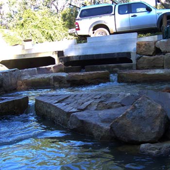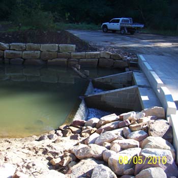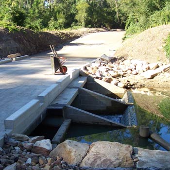 The fish way required the stream to be diverted using sheet piles. The culverts were founded on 15 of 400mm diameter continuous flight auger piles 10metres in depth. Piles were tested and cut back to support a concrete base slab with integral deep beams. Wing walls are constructed from large sandstone blocks with internal wing wall and spillway constructed from reinforced core filled block work.