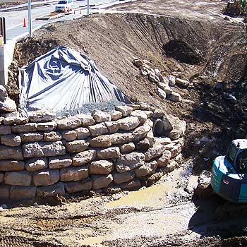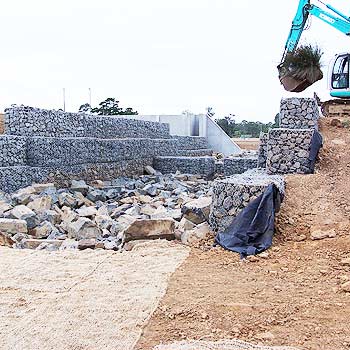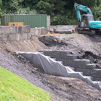 Simple put this involves compacting selected earth fill in layers sandwiched by reinforcement mesh grid to form a structural building platform to carry a roadway or building. The earth reinforcing can be made from many different shaped product such as steel straps, Galvanised steel rod, Tensar mesh, or gabion mesh. Collective Civil installs them all.