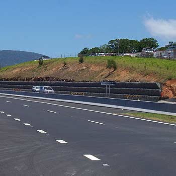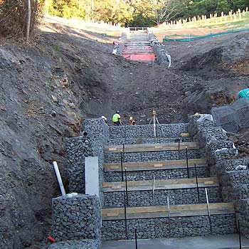 Gabion wall at the northern abutment of the Sea Cliff bridge. There is a gabion facing on each side of the bridge abutment. A high strength tensar geogrid connects each side at 0.5m gabion levels to create a reinforced earth wall. |