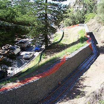 This 3m high gabion wall was constructed by Collective Civil to form a rock fall barrier for the RTA at Coal cliff. It is 3m high and has gabion mesh tail at each 1m level sandwiched in the backfill. |