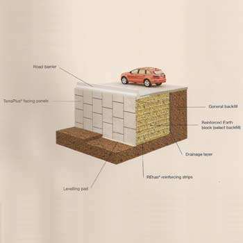 This type of structure is quick to build. Collective Civil can design and construct this type of structure used mainly for Main road bridge abutments and road embankments. While it is a relatively simple structure to build the concrete panels can be decorated to various budgets and taste. The panels are fixed to the steel straps that are sandwiched in the select compacted earth fill. |
