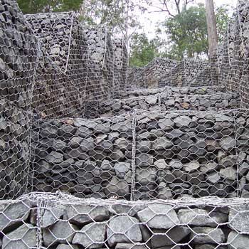Close up of rocks confined in wire boxes constructed by Collective Civil to form a spillway for flood water at Tallowa Dam for Leighton Contractors and Sydney Water. The boxes filled with rocks can be made from welded mesh or like this example from hexagonal twist shape mesh.