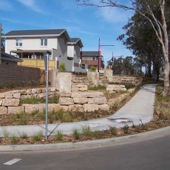 All the walls at Middelton Grange Hoxton Pk in Western Sydney were built by Collective Civil including these textured block wall. The walls are on the boundary line and allow level blocks of land to be sold at this landscaped subdivision. Other types of walls here are our rock walls and gabion walls. It is easy to inspect and choose the type of wall that suits your need or architectural tastes. |